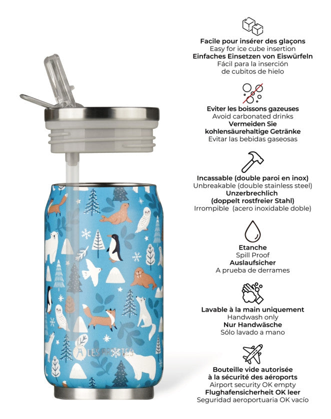 Den praktiske thermoflaske i dobbeltvægget rustfrit stål er designet som en dåsesodavand, som gør det ekstra sjovt for børn at huske at drikke.