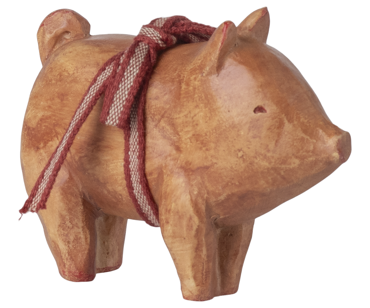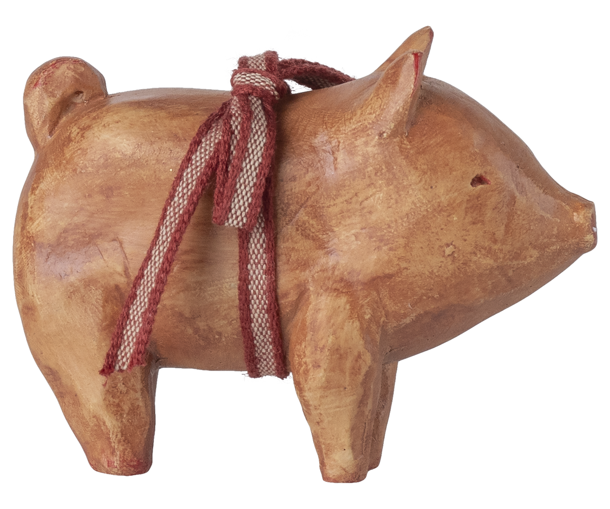 Fin lille julegris, der er næsomt formet i hænderne og håndmalet.