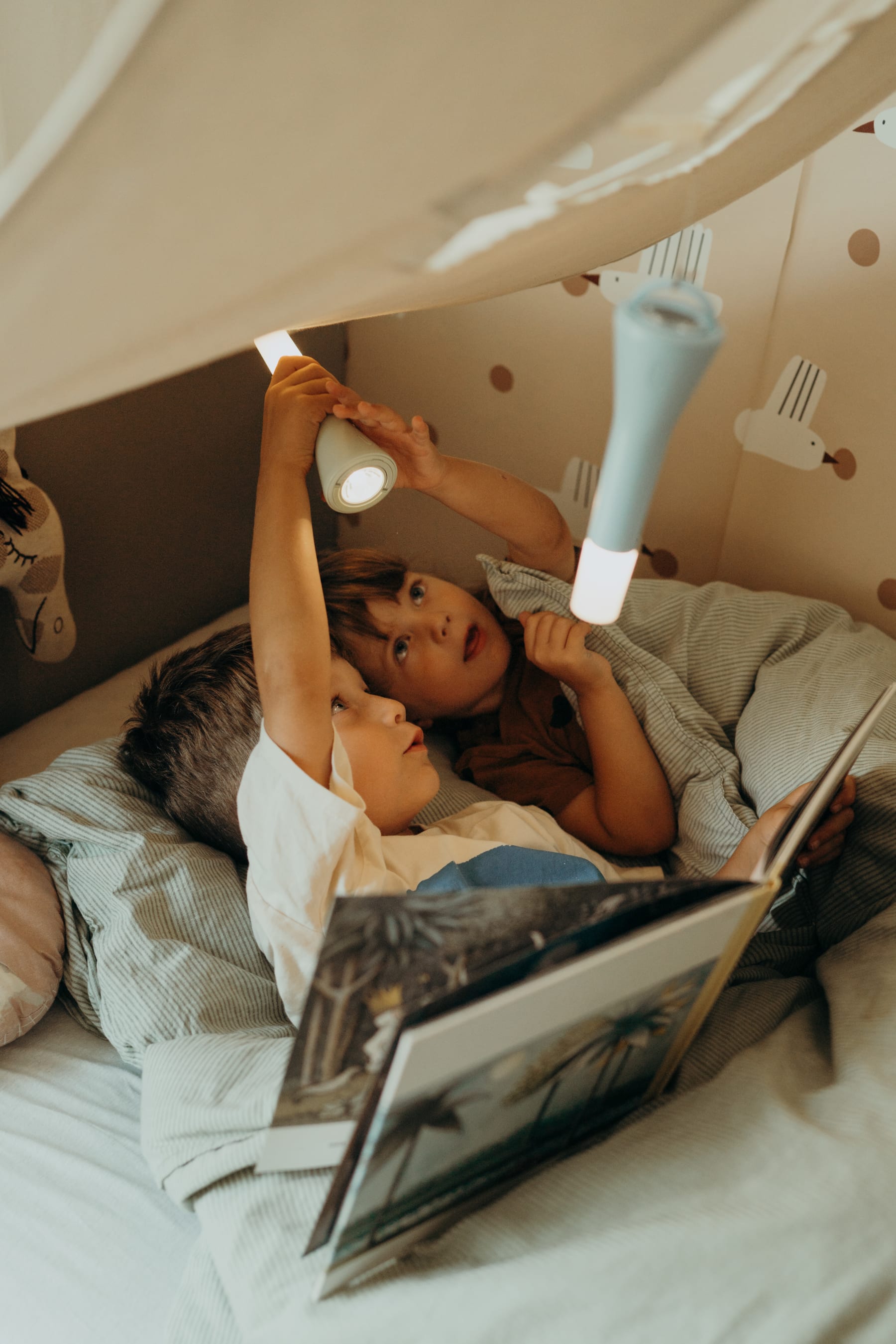 Lommelygten bliver en legekammerat, der giver timevis af sjov. Brug den som en klassisk lommelygte, placer den på en overflade for at skabe en varm atmosfære under godnathistorierne, eller hæng den op i med den indbyggede ring for at bruge som lampe