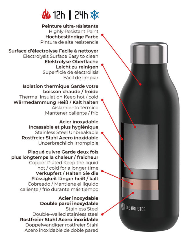 Takket være den dobbeltvægget rustfrie stål flaske, kan den holde dine drikke varme i 12 timer eller kolde i 24 timer.