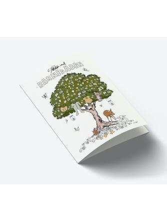 Kort med teksten Tillykke med barnedåben og et motiv med træ og gaver